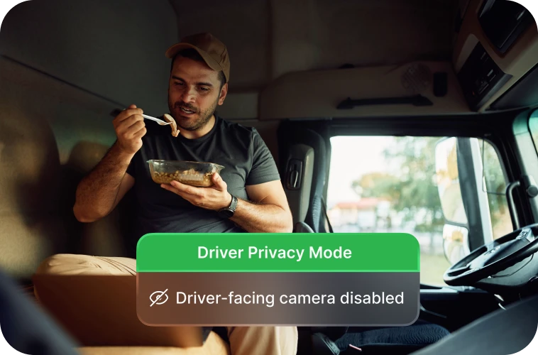 Use Driver Privacy Mode to disable the driver-facing camera. To ensure drivers’ privacy off duty, activate the camera during working hours only.